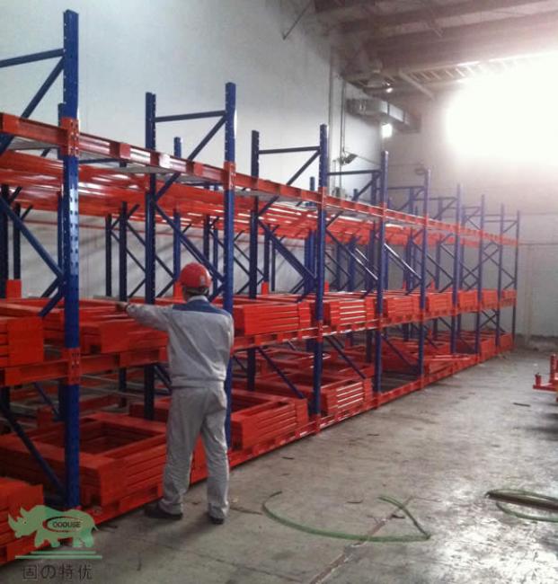 采用轨道和托盘小车相结合,利用货物的自重,实现货物的先进后出,适合大批量同类型货物的存储,空间利用率很高。